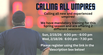 If you are interested in umpiring for the Spring 2026 season, please plan to attend one of our mandatory training sessions. These sessions are required for both new and experienced umpires. As a reminder, you will receive 3 points for attending, which will count toward future division promotions and pay increases.